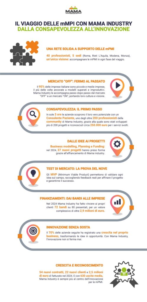 Mama Industry (e la startup collegata Mama Innovation) segue oggi un portfolio di circa 300 clienti, che sono accompagnati in questo viaggio grazie a un team di 40 dipendenti (cresciuto nel 2024 con l’assunzione di 16 nuove risorse), distribuiti in 5 sedi sul territorio italiano (Roma, Rieti, L’Aquila, Modena e Monza) e organizzato in business unit che lavorano in modo integrato e sinergico per coprire ogni aspetto e ogni fase del percorso dei clienti: dalla consulenza alla progettazione del cambiamento, dalla partecipazione ai bandi pubblici per il finanziamento dei progetti, fino al loro sviluppo, passando per la consulenza per il recruiting delle risorse umane fino agli aspetti di marketing e comunicazione e di primo test sul mercato.