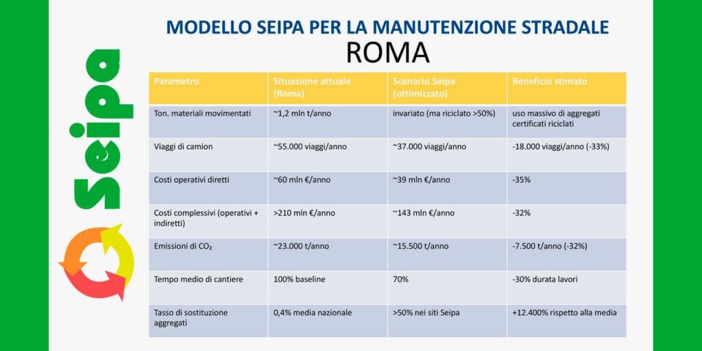 A Roma ogni anno si aprono tra i 300 e i 600 cantieri stradali, per un volume complessivo di circa 1,2 milioni di tonnellate di fresato d’asfalto ed altri materiali inerti da movimentare. Questo si traduce in oltre 55.000 viaggi di camion su rete urbana (8 mila chilometri di strade), con un costo operativo stimato in oltre 60 milioni di euro l’anno e un costo ambientale aggiuntivo che può superare i 150 milioni di euro, dovuto a traffico, consumo di carburante ed emissioni di CO2. Sono i dati che emergono dalle elaborazioni interne del Gruppo Seipa.